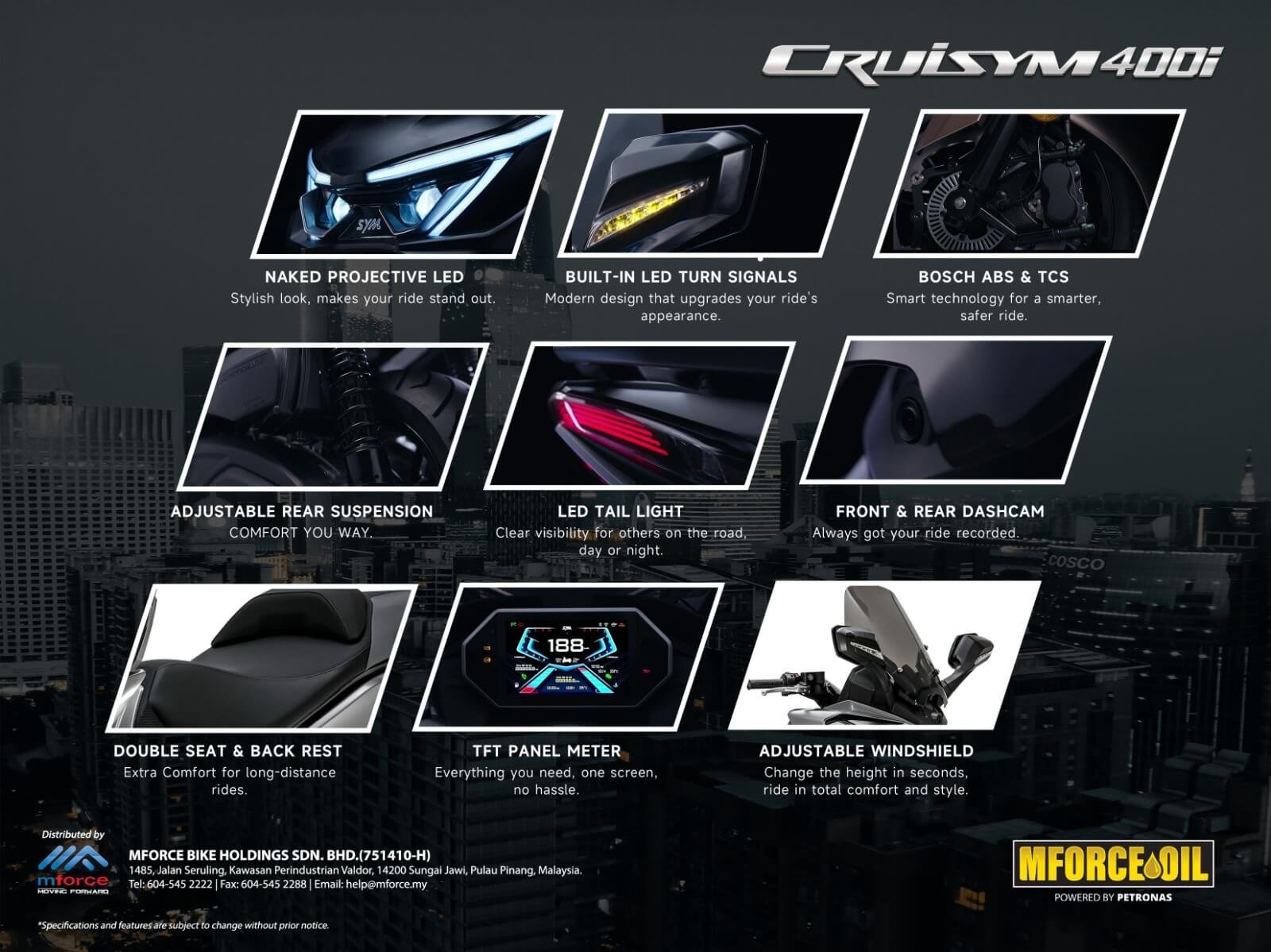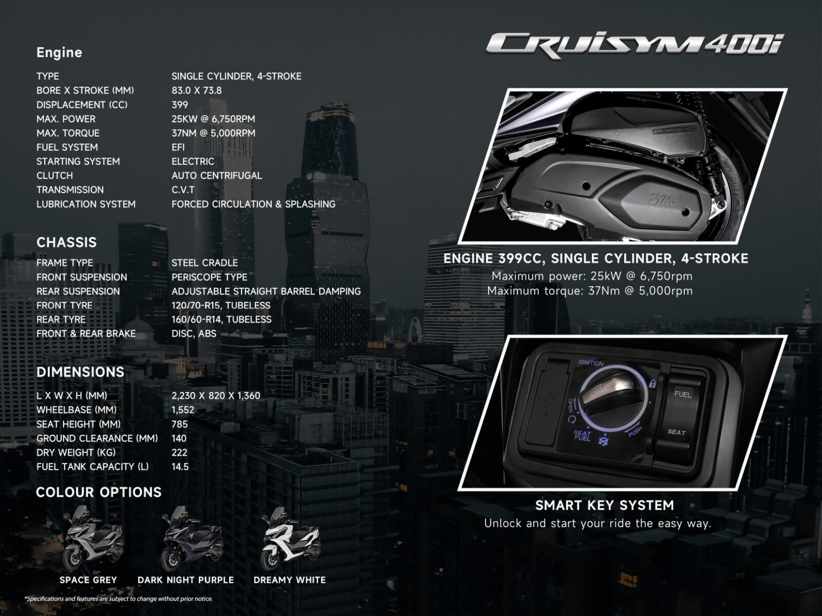 Practical features include full LED lighting, a spacious design, a comfortable 785mm seat height, and a large 14.5L fuel tank for longer journeys. With its modern styling and advanced technology, the Cruisym 400i redefines the maxi scooter experience.