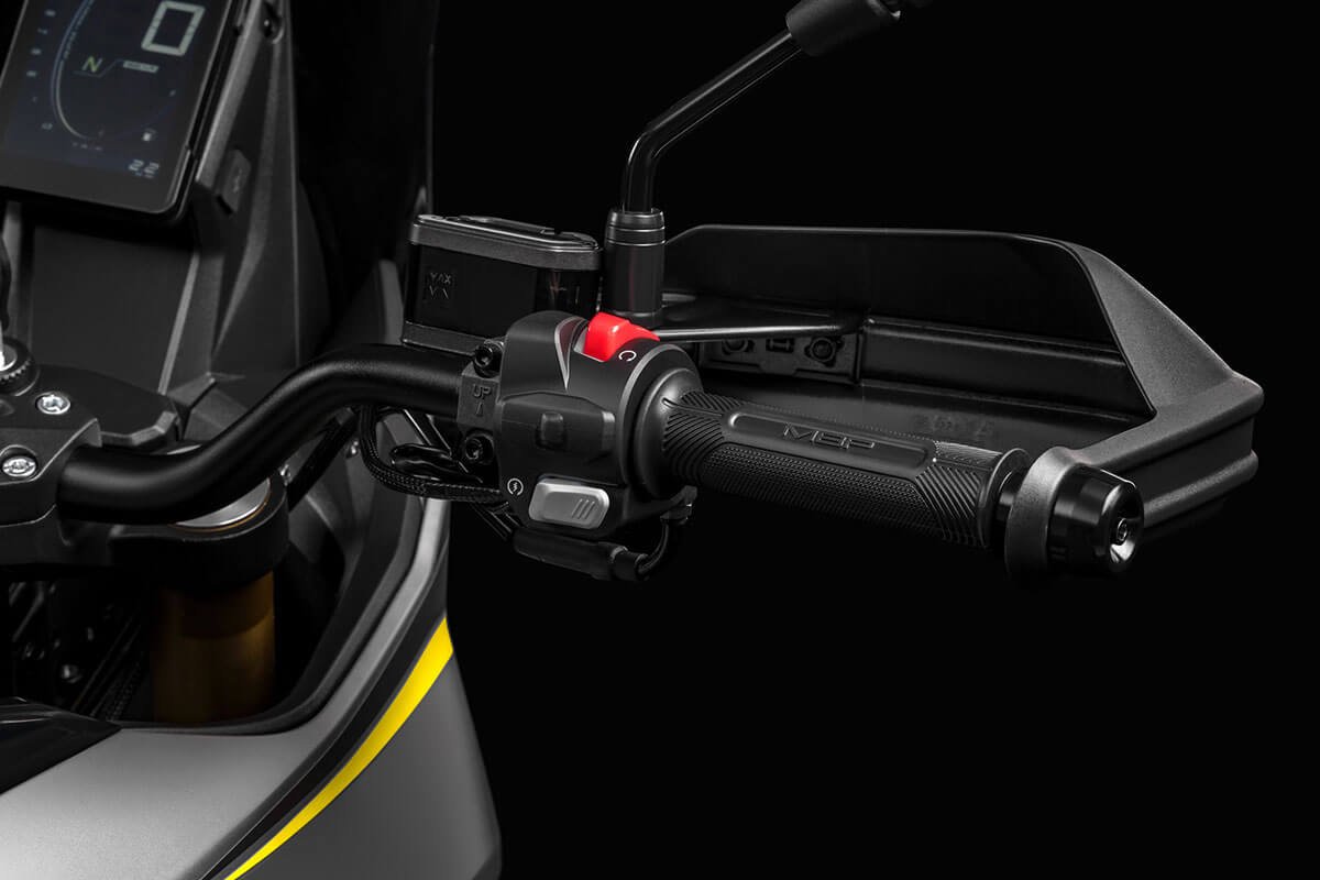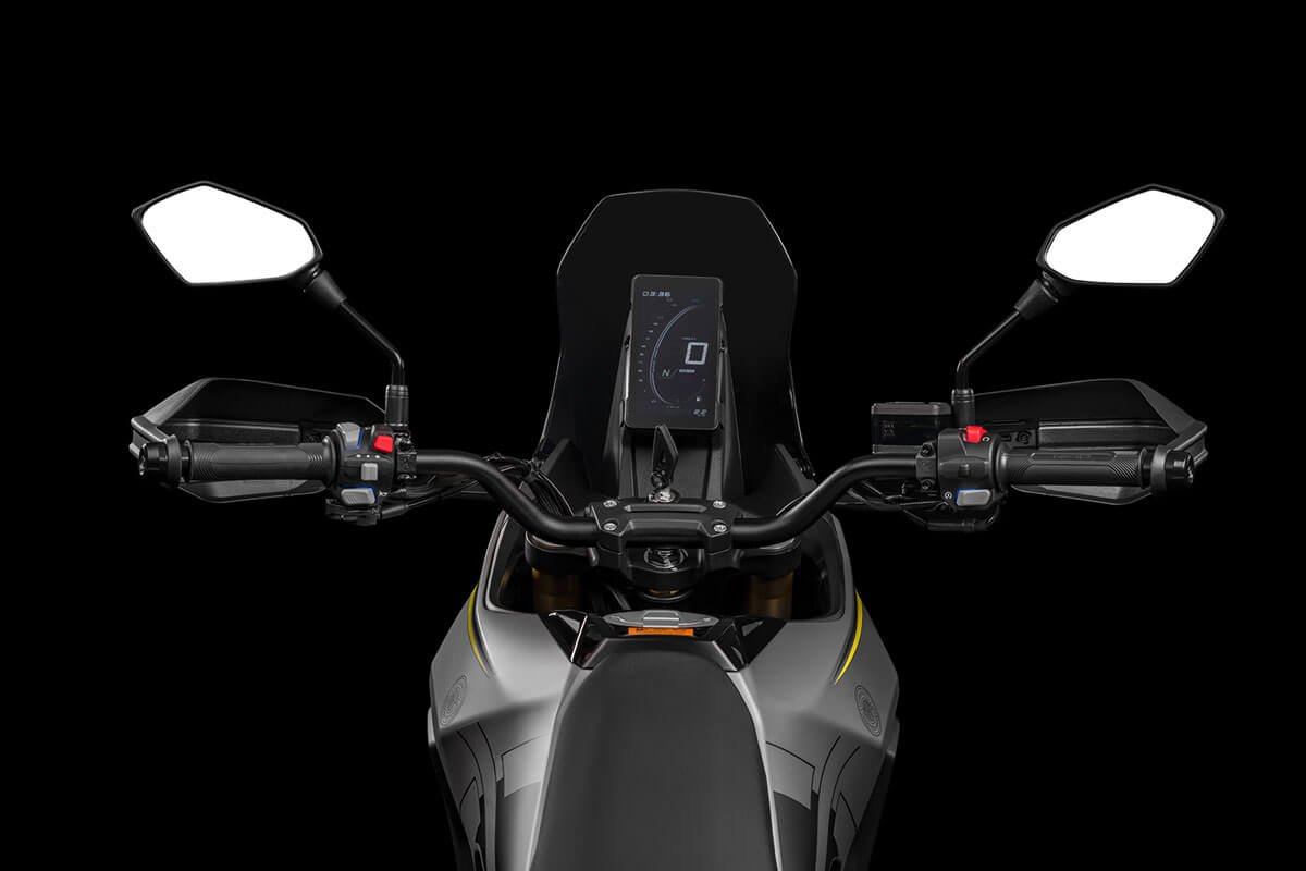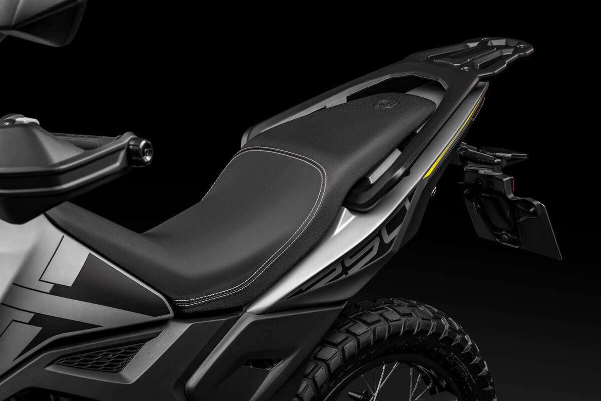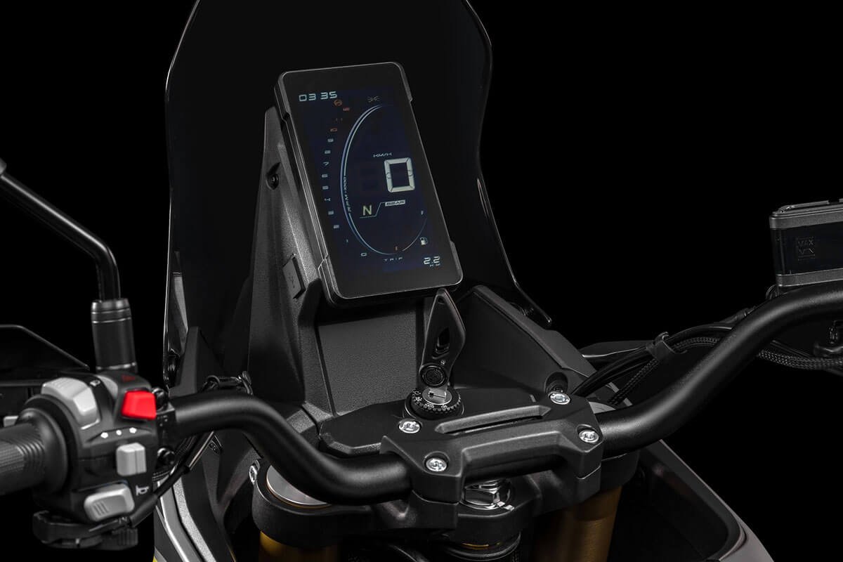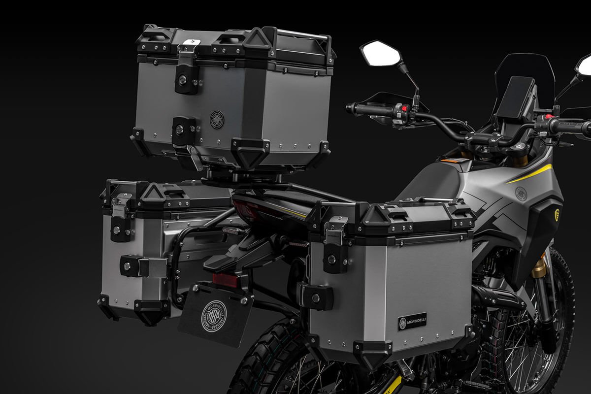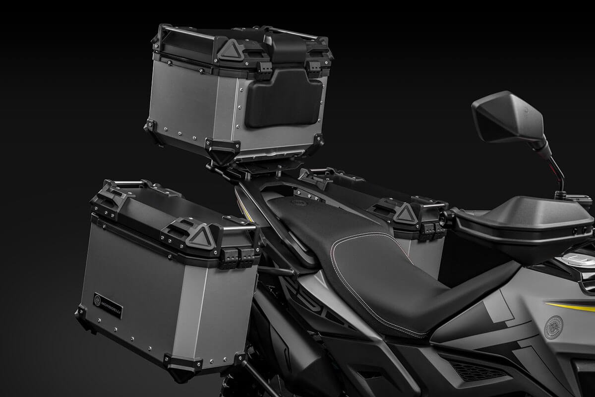 With a 41 mm inverted fork, adjustable rear suspension, spoked wheels and dual-purpose tires, it offers control and comfort even in the toughest conditions. Ventilated disc brakes with ABS and an 820 mm seat height ensure safety and ergonomics for riders of all sizes. The vertical LCD display, rally-inspired, provides clear information at all times. Completing the setup are a USB port, backlit handlebar controls, and a full LED system with the distinctive X-Stack signature lighting. For long trips, rigid panniers or waterproof soft bags are available, compatible with the optional rear rack.