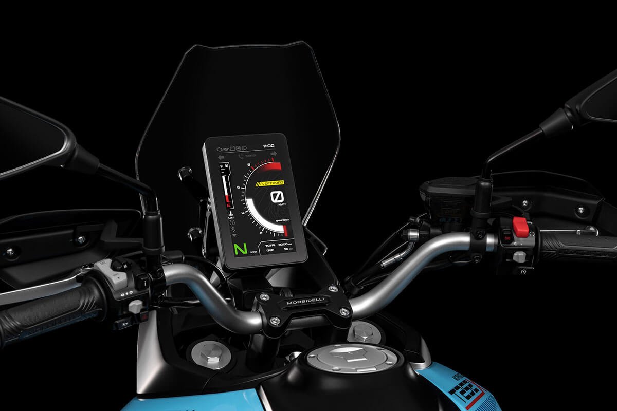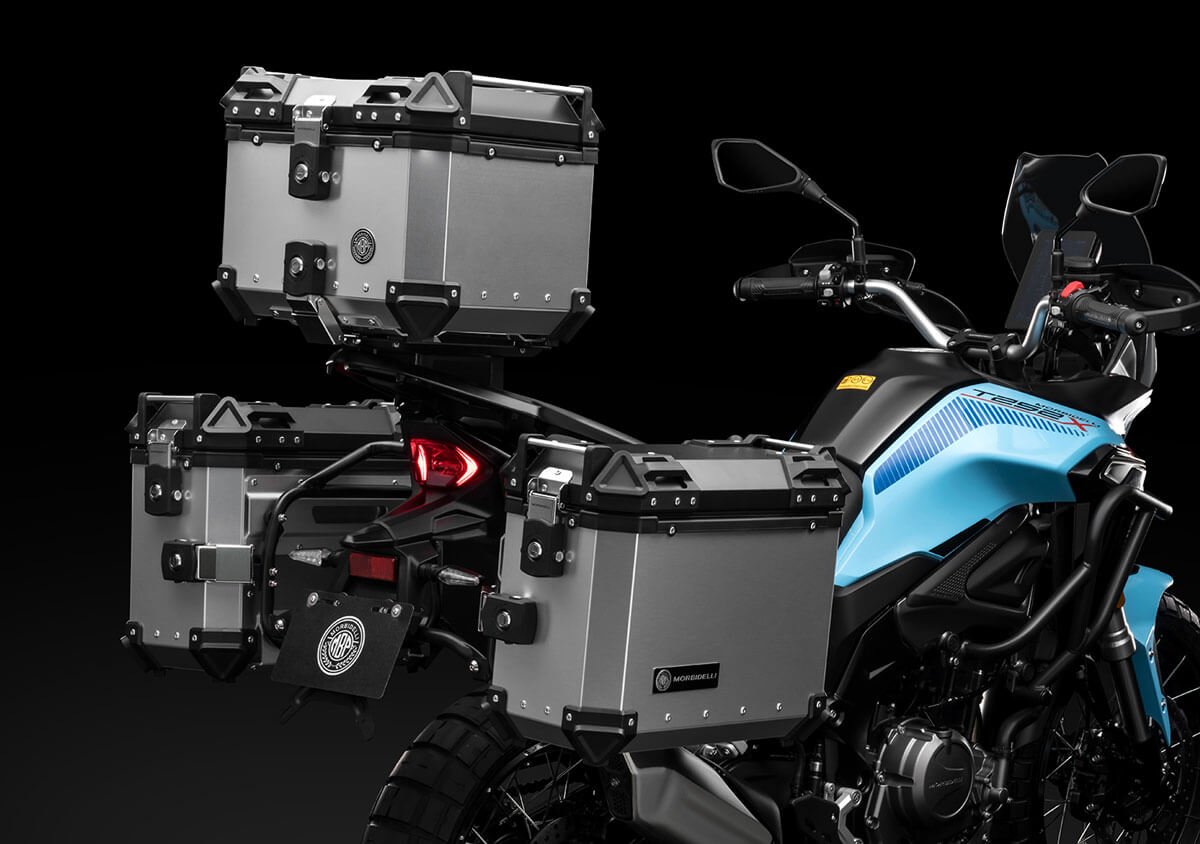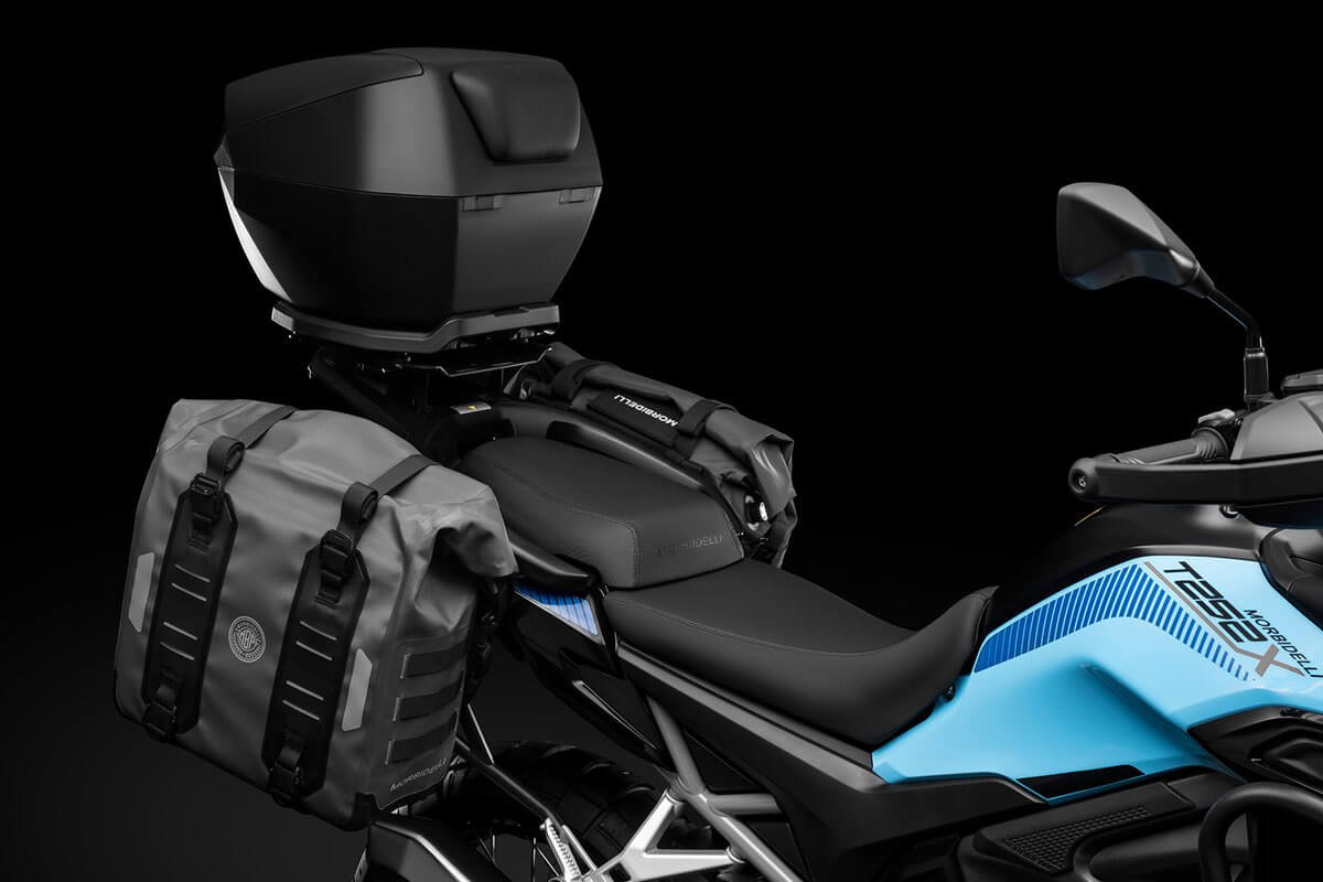 Weighing only 195 kg, the T252X features long-travel suspension (160 mm front / 140 mm rear), Bosch ABS with rear deactivation, spoked wheels with Pirelli tubeless tires, and a vertical TFT dashboard with GPS projection via Morbidelli Connect. Three selectable riding modes (Urban, Touring, Off-Road) adapt the experience to every terrain.